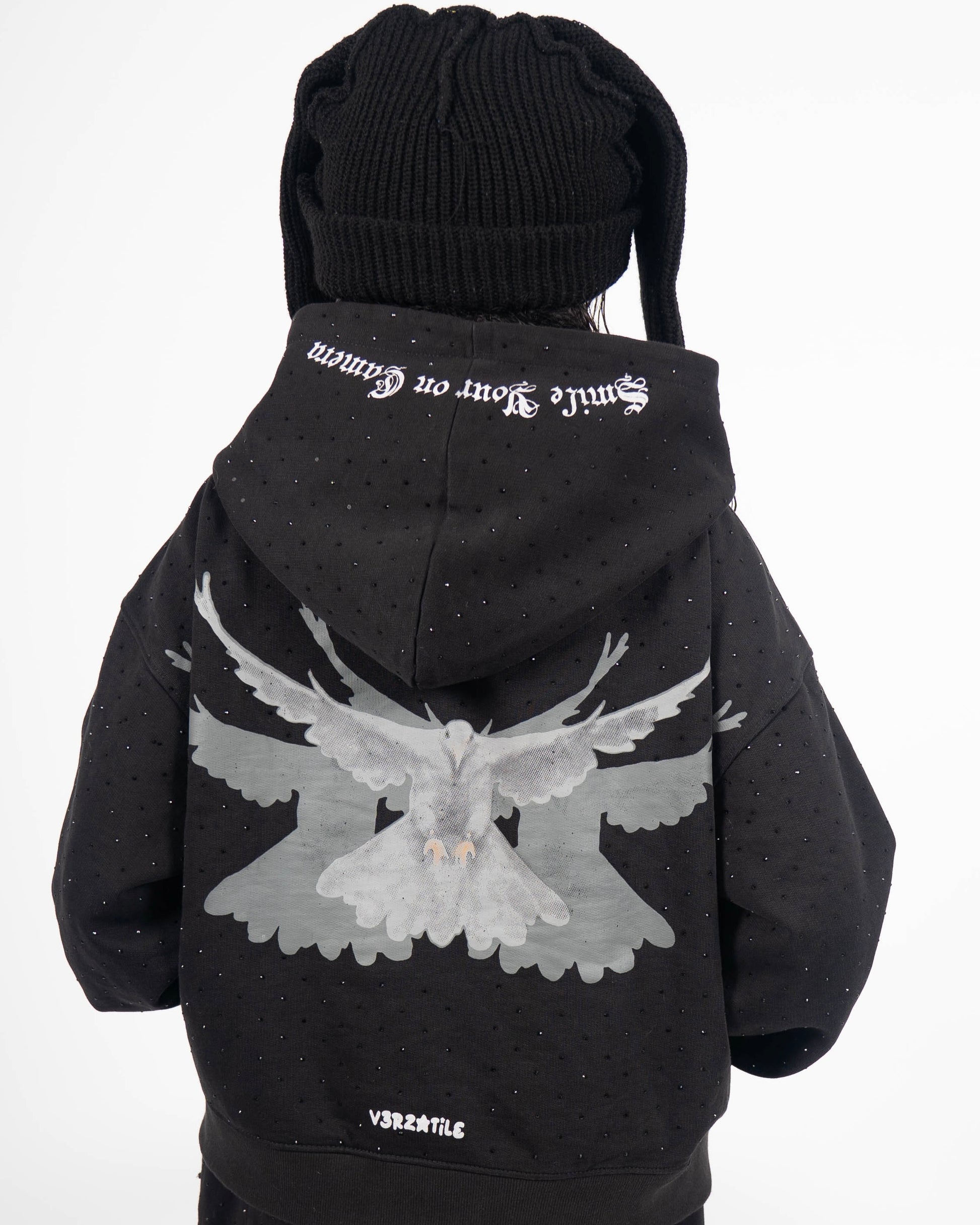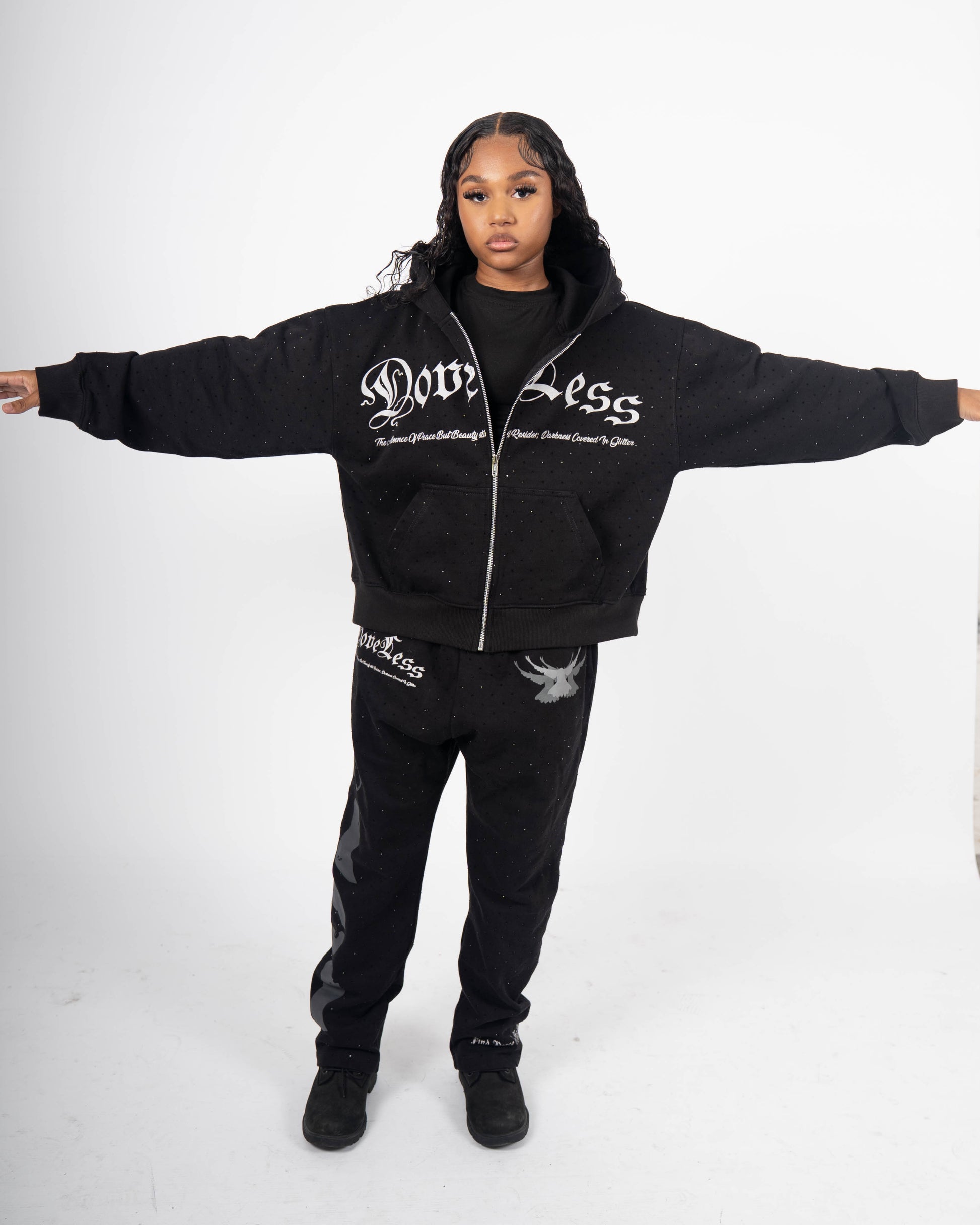 This hoodie represents the core of the Doveless line — the tension between darkness and beauty. Inspired by my sister’s artistic spirit, it’s a tribute to her ability to create brilliance in the midst of heaviness. The black rhinestones aren’t just decoration — they’re reminders that even in loss, there’s still light.